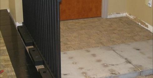 Our system includes pre-glued carpet tiles for installation on ramp components, providing a finished floor structure, with minimum on site work. The carpet tiles are pre-glued using our proprietary “ hot melt “ which is protected with removable wax paper sheet.