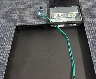 Electrical Power is integrated into the floor structure using a pre-manufactured electrical system. All components are connected via multi-conductor snap connections ( no hard wiring ) and can be easily installed or changed without rewiring. The system includes a floor box that provides two duplex outlets, as well as two communication outlet mounting locations. The floor boxes are connected to each other to a building power source.